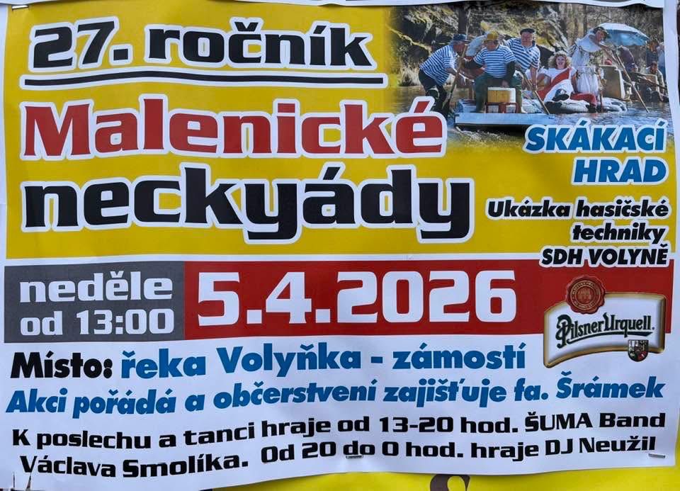 Zveme na 27. ročník Neckyjády v neděli 5. 4. 2026. Akce začíná od 13:00 v lokalitě Pod Pržma. Můžete se těšit na hudební vystoupení ŠUMA Band od 13:00 do 20:00. Od 20:00 do 24:00 hraje DJ Neužil. Občerstvení zajišťuje firma Šrámek. Pro děti skákací hrad a ukázka hasičské techniky SDH Volyně.